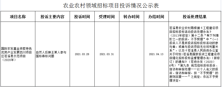 農(nóng)業(yè)農(nóng)村領(lǐng)域招標(biāo)項(xiàng)目投訴情況公示表
