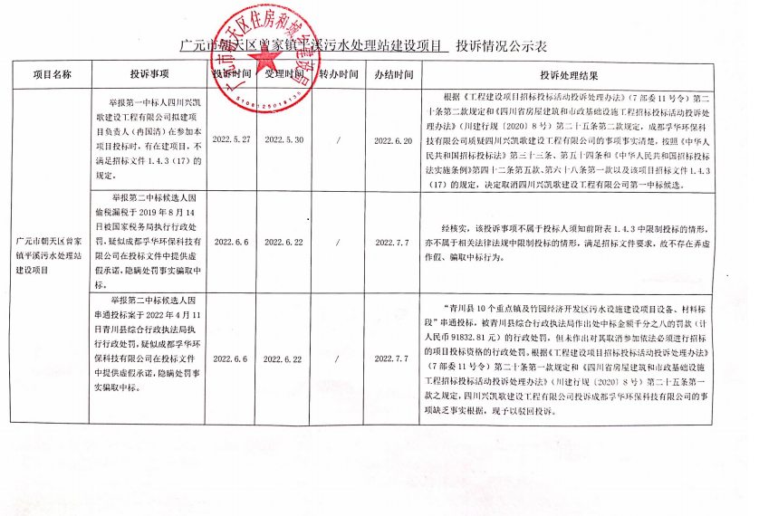 廣元市朝天區(qū)曾家鎮(zhèn)平溪污水處理站建設(shè)項目投訴情況公示表
