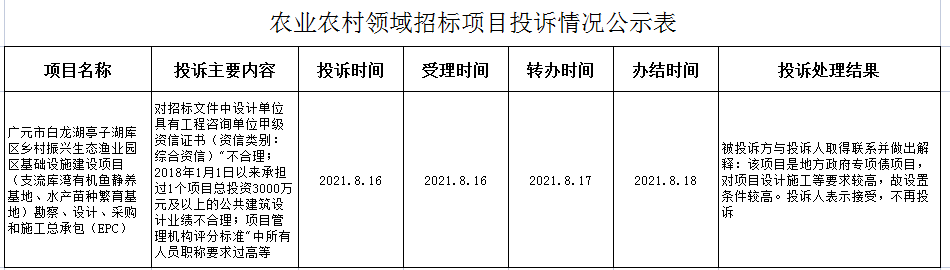 農業(yè)農村領域招標項目投訴情況公示表