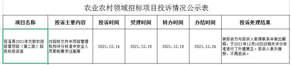 農(nóng)業(yè)農(nóng)村領(lǐng)域招標(biāo)項(xiàng)目投訴情況公示表