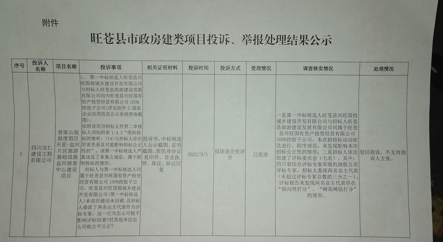 旺蒼縣市政房建類項目投訴、舉報處理結果公示