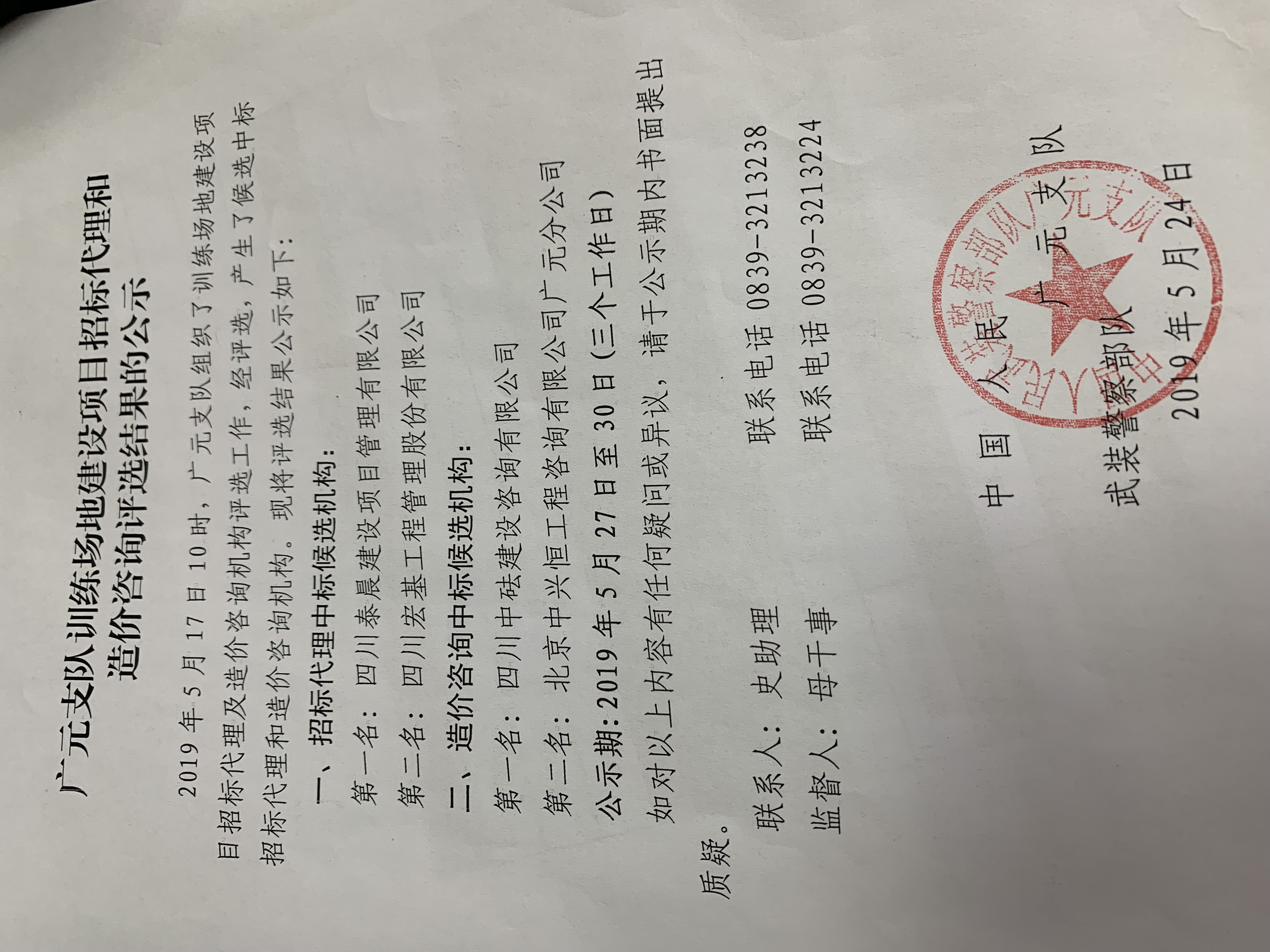 2019年5月17日10時,廣元支隊組織了訓練場地建設(shè)項目招標代理及造價咨詢機構(gòu)評選工作,經(jīng)評選,產(chǎn)生了候選中標招標代理和造價咨詢機構(gòu)。現(xiàn)將評選結(jié)果公示如下: