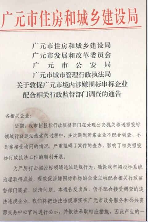 關(guān)于敦促?gòu)V元市境內(nèi)涉嫌圍標(biāo)串標(biāo)企業(yè)配合相關(guān)行政監(jiān)督部門(mén)調(diào)查的通告
