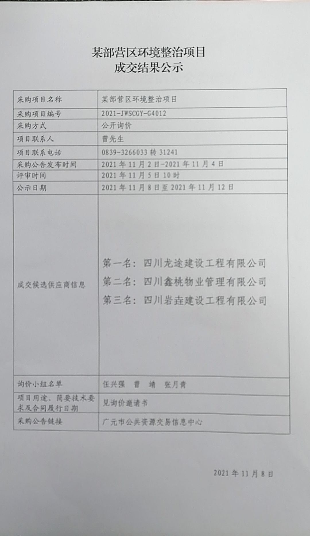 某部營區(qū)環(huán)境整治項目成交結(jié)果公示