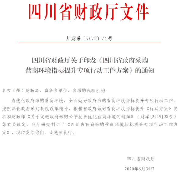 (2)《四川省財(cái)政廳關(guān)于印發(fā)<四川省政府采購(gòu)營(yíng)商環(huán)境指標(biāo)提升專項(xiàng)行動(dòng)工作方案>的通知》(川財(cái)采〔2020〕74號(hào))